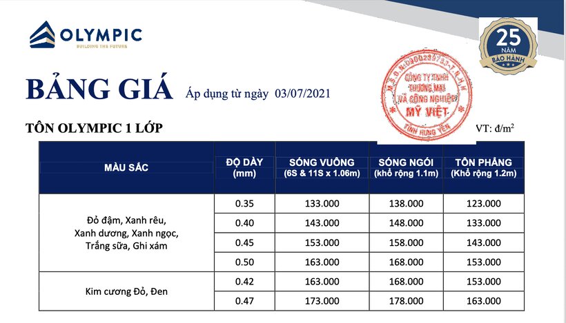 Lưu ý: Trên đây là mức giá niêm yết được cập nhật bởi nhà sản xuất Mỹ Việt Group với sản phẩm tôn 1 lớp Olympic chính hãng.