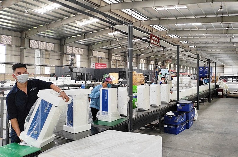 Công nhân dây chuyền sản xuất bình nước nóng đi làm trở lại sau Tết nguyên đán Nhâm Dần 2022